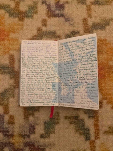 Every year around this time, for the past handful of years, I have this vague idea that I’ll do reading differently next year, which seems suspiciously like a reading goal, something I’ve already suggested I feel squeamish about. Go more slowly, make more notes, memorize a few poems. And every year I get swept up in the year’s own particular energy—more vibes than method. This year I reread (or reread via audiobook) a few books: Lincoln in the Bardo, Of Mice and Men, The Martian Chronicles, The Writing Life, The Lover (for the third time), and Stoner. Lincoln and Mice because I wanted to hear them performed; Martian for sci-fi book club, Dillard because I thought it might be a shot in the arm (it wasn’t), Duras with APS, and Stoner because I dared myself to do it for book club and had to see it through. The Lover was more devastating this time around than it had ever been, and I surprised myself by enjoying Stoner more than I had the first time, an enjoyment devoid of archness. I mentioned in my last post that a book can be a photograph or a diary; add to that how it can also be a Rorschach test. The book doesn’t change, but we do.